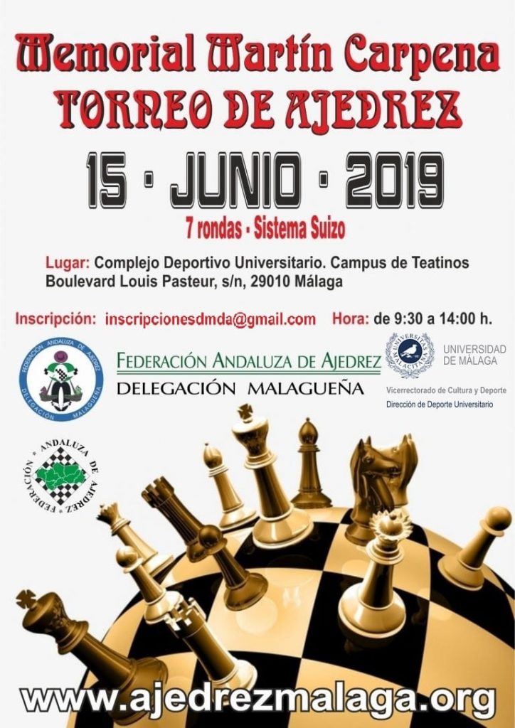 El pasado Domingo 2 de Junio del 2.019, a las 17.00 horas dio comienzo el “II Master de Diputación de Málaga”, celebrado en Málaga Capital, en especial en la sede de la Federación Malagueña de Ajedrez, en calle Malpica.